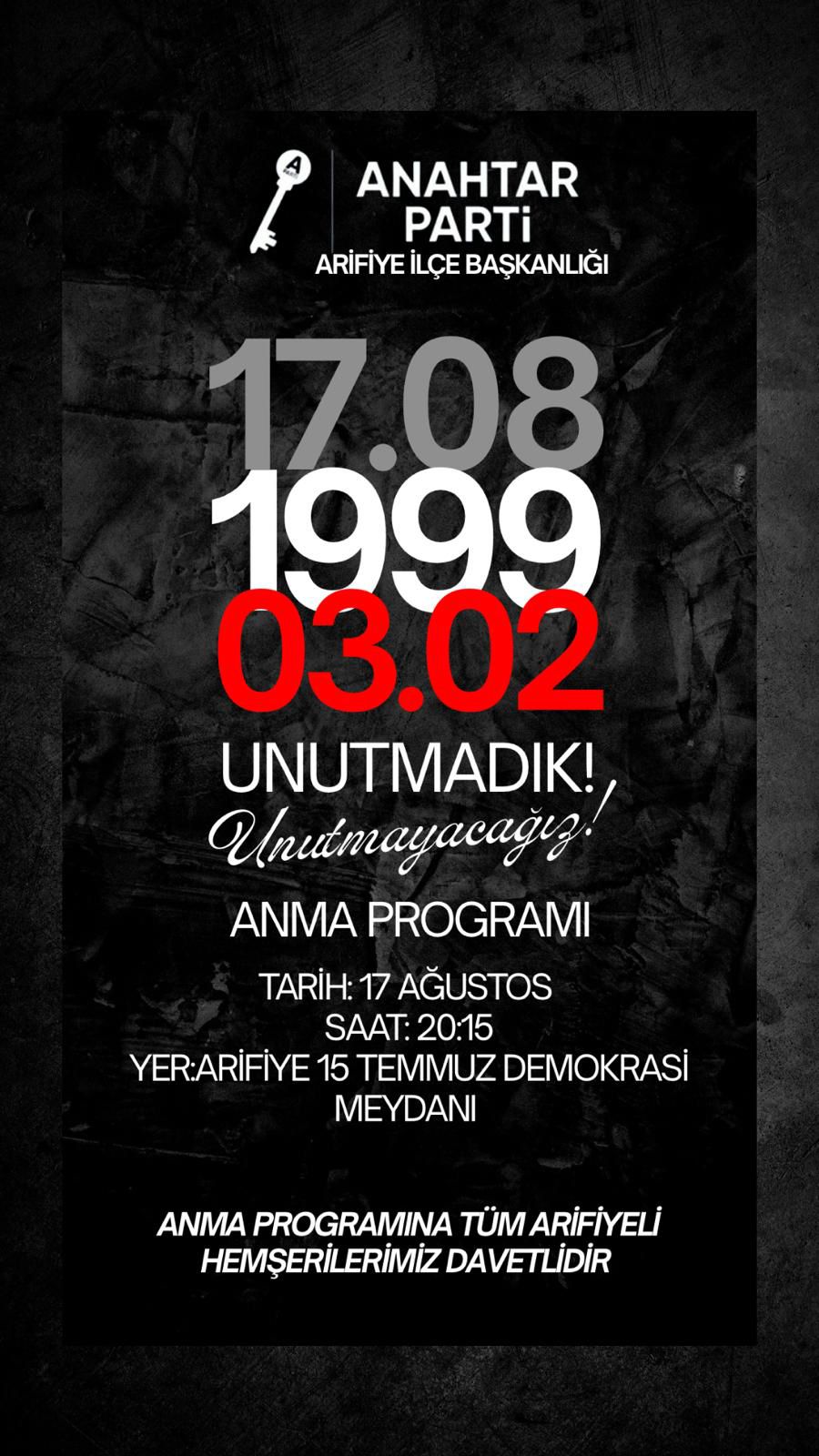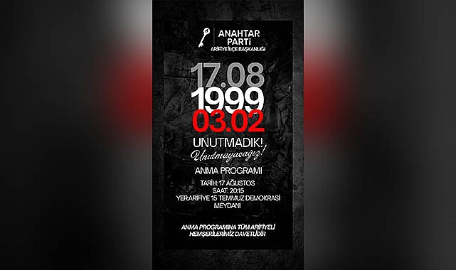 Anahtar Parti Arifiye İlçe Başkanlığı, tüm Arifiyeli hemşehrileri bu anlamlı ve duygu dolu anma programına davet ederek, geçmişte yaşanan büyük felaketi unutmamak ve aynı acıların bir daha yaşanmaması için farkındalığı diri tutmanın önemine vurgu yaptı.