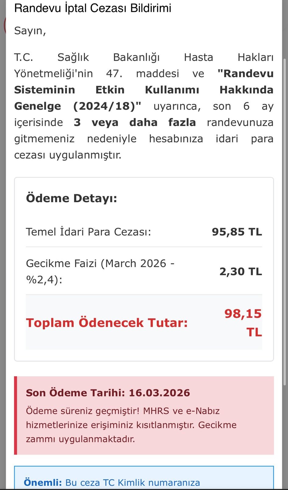 Edinilen bilgilere göre, sahte sayfada vatandaşlara “iptal edilen randevular nedeniyle 90 TL borç oluştuğu, gecikmeyle 98 TL’ye yükseldiği” yönünde uyarı gösteriliyor. Ödeme yapılmadığı takdirde randevu alınamayacağı belirtilerek kullanıcılar panikletiliyor.